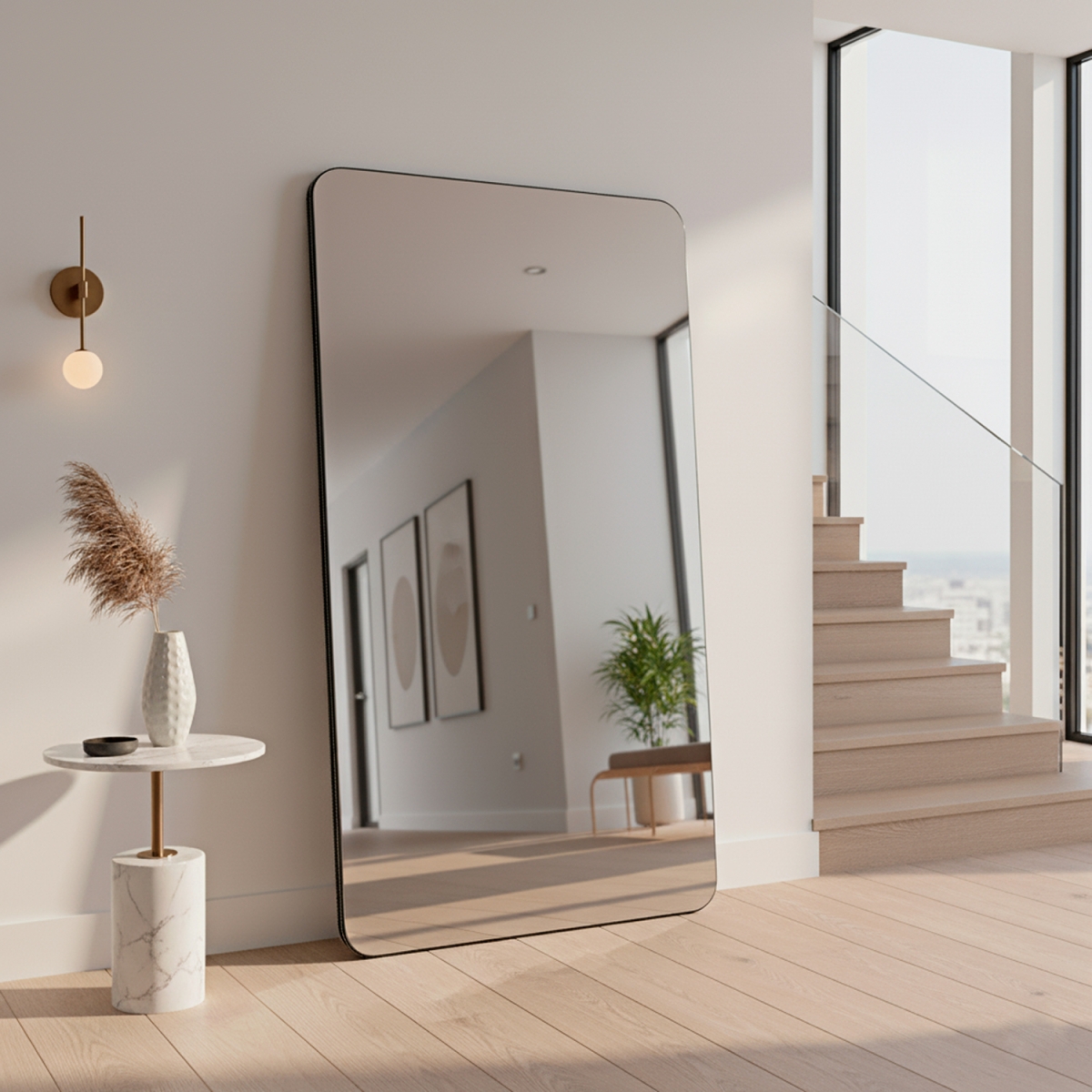 Espelho de Chão Jordânia Corino 180x90cm Retangular CantosO Espelho de Chão Jordânia Corino Retangular Cantos é uma peça de destaque que une elegância e funcionalidade em um design minimalista e contemporâneo. Ideal para ambientes sofisticados, ele amplia a sensação de espaço e luminosidade, transformando qualquer ambiente em um cenário digno de revista. Produzido com espelho de alta performance, livre de cobre e solventes agressivos, oferece reflexo nítido e sem distorções, além de maior resistência à oxidação e durabilidade superior. O modelo acompanha penduradores verticais e horizontais, nivelador e kit de fixação completo (buchas e parafusos), permitindo que seja utilizado tanto apoiado no chão quanto fixado na parede. A embalagem foi cuidadosamente desenvolvida com proteção anti-impacto, plástico bolha e caixa de madeira, assegurando máxima proteção durante o transporte. |